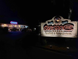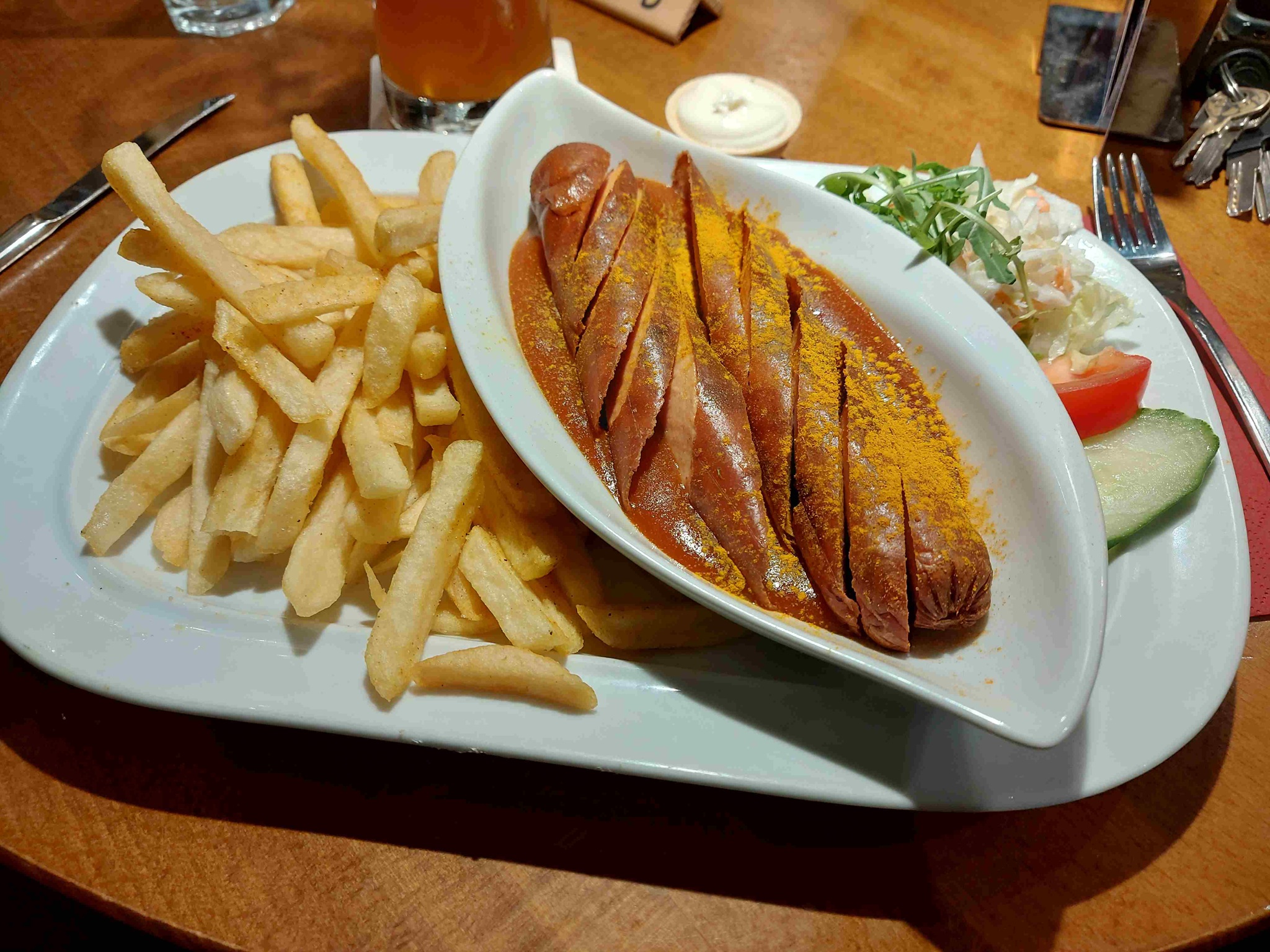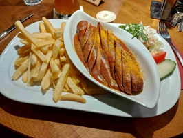Wir essen abends im Restaurant "Pier One" auf dem Campingplatzgelände, das Essen war sehr gut, allerdings waren etwa 50€ für Currywurst mit Pommes und Getränken auch kein Schnäppchen.