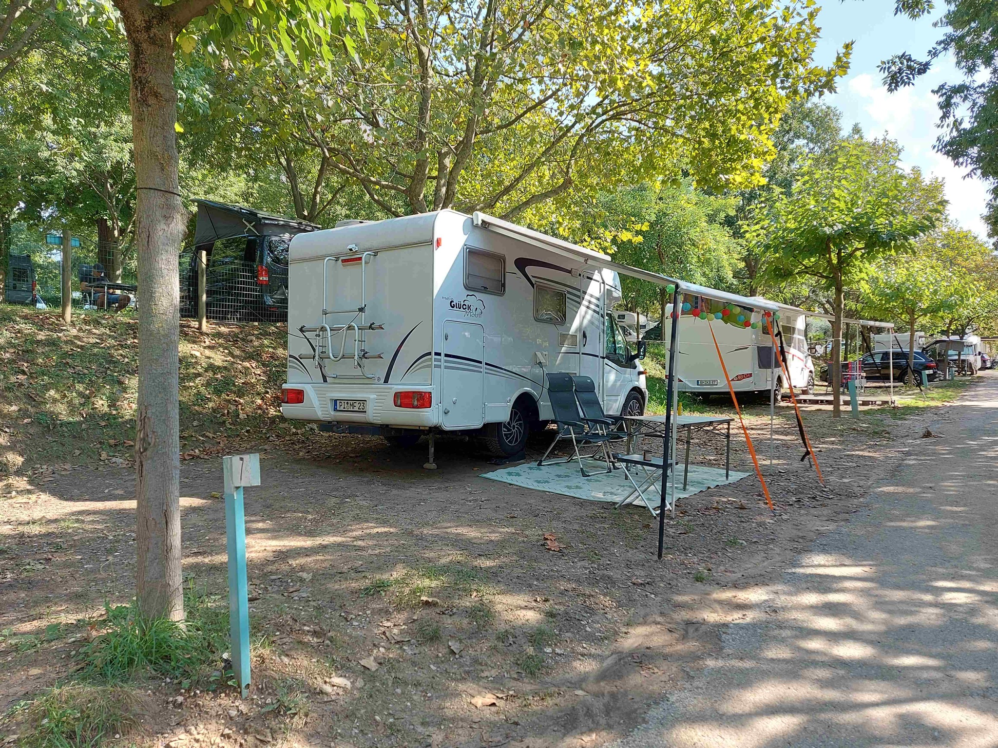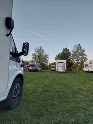 Wir haben den Platz ja schon recht häufig angefahren, aber so voll haben wir ihn noch nie erlebt. Die komplette Wiese war vollgeparkt mit Wohnmobilien in allen Größen, Formen und Farben. Positiv zu erwähnen ist allerdings, dass der Platz immer noch 7€ die Nacht kostet, unverändert seit unserem ersten Besuch vor etwa 10 Jahren.