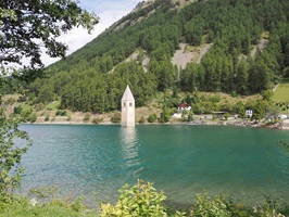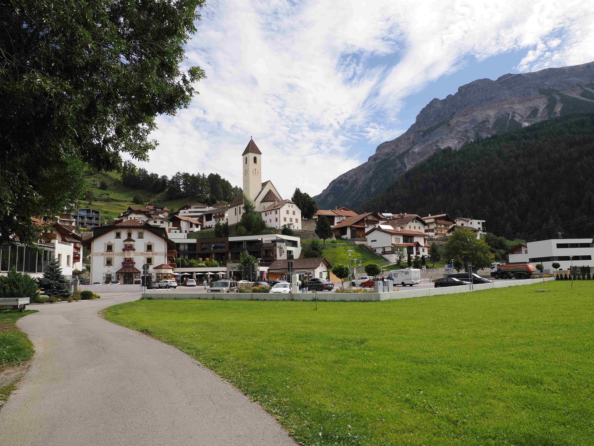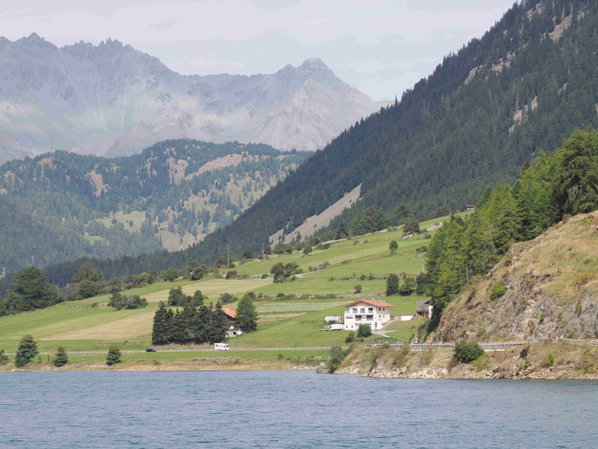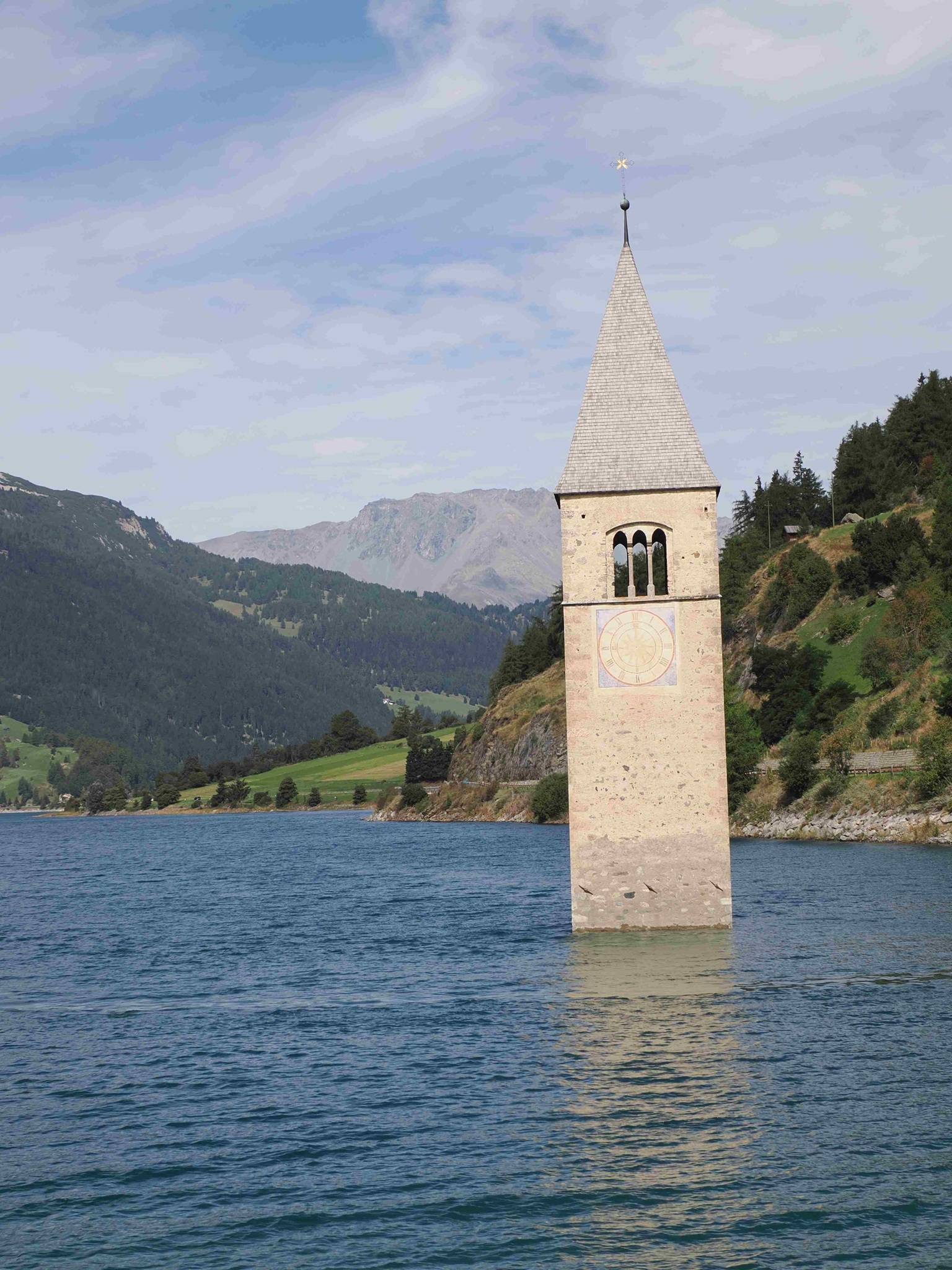 Die Nacht war sehr frisch, wir hatten gerade einmal 10°C und mussten doch ein wenig heizen. Unsere heutige Route soll uns über den Reschenpass führen und wenn es vom Wetter passt, wollen wir auch noch über das Stilfser Joch fahren. Insgesamt war es schon ziemlich voll, sowohl auf der Fahrt zum Reschenpass als auch der Pass an sich. Es sind aber alle entspannt und geduldig hintereinander her gefahren, so darf es gerne häufiger sein. Wir machen einen kurzen Fotostopp an der versunkenen Kirche im Reschensee, der Hauptparkplatz war uns aber zu voll, so sind wir auf den kleineren Platz direkt hinter dem Tunnel gefahren.
