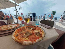 Also hängen wir etwa 1,5 Stunden Fahrt ran und landen, natürlich erst am Supermarkt 😂 Ein riesiger Iper Martinelli vor Lazise ist das Zwischenziel, hier decken wir uns für die nächsten Tage ordentlich mit Lebensmitteln ein. Exakt um 17 Uhr erreichen wir den Campingplatz Spiaggia d'Oro, direkt am Gardasee. Der Stellplatz "Via Napoli Nr. 8" ist ziemlich schräg und eher für kleinere Fahrzeuge gedacht, wir sind aber froh erstmal angekommen zu sein. Nachdem wir und schnell eingerichtet haben, sind wir in die Pizzaria am Platz gegangen und haben uns ordentlich gestärkt.