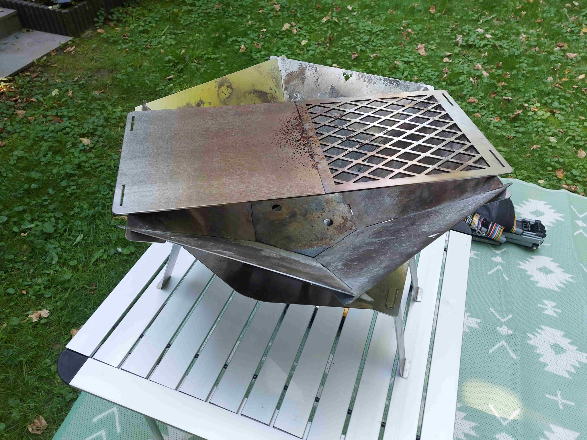 Auf Grund der Fülle auf den Stell- und Campingplätzen kommt die Feuerschale leider immer weniger zum Einsatz, das Prinzip ist aber wirklich super, aus wenigen Edelstahl Teilen kann eine vollständige Feuerschale mit Sockel und Grillrost zusammengebaut werden, durch die Rauchentwicklung nutzen wir sie aber meist im Herbst oder Winter wenn die Plätze entsprechend leerer geworden sind.