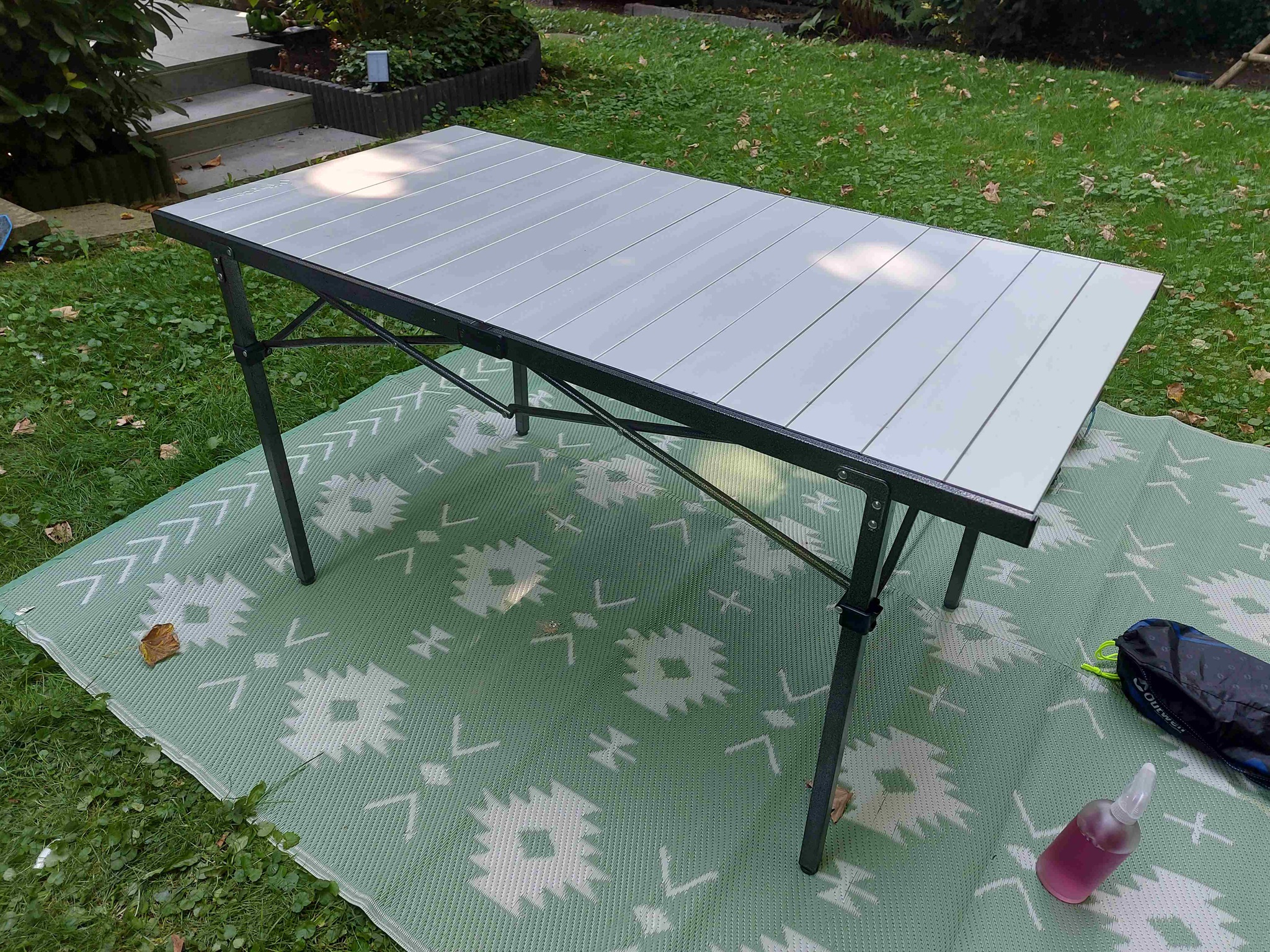 Und bis jetzt sind wir sehr zufrieden, er ist inerhalb weniger Sekunden aufgebaut und steht sehr stabil, die einzelnen Aluelemente muss man entweder mögen oder man deckt sie mit einer schicken Tischdecke ab. Für zwei Personen ist er mit 136cm x 70cm schon ziemlich groß, aber wir schafen es immer wieder jeden Zentimeter zu nutzen.