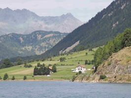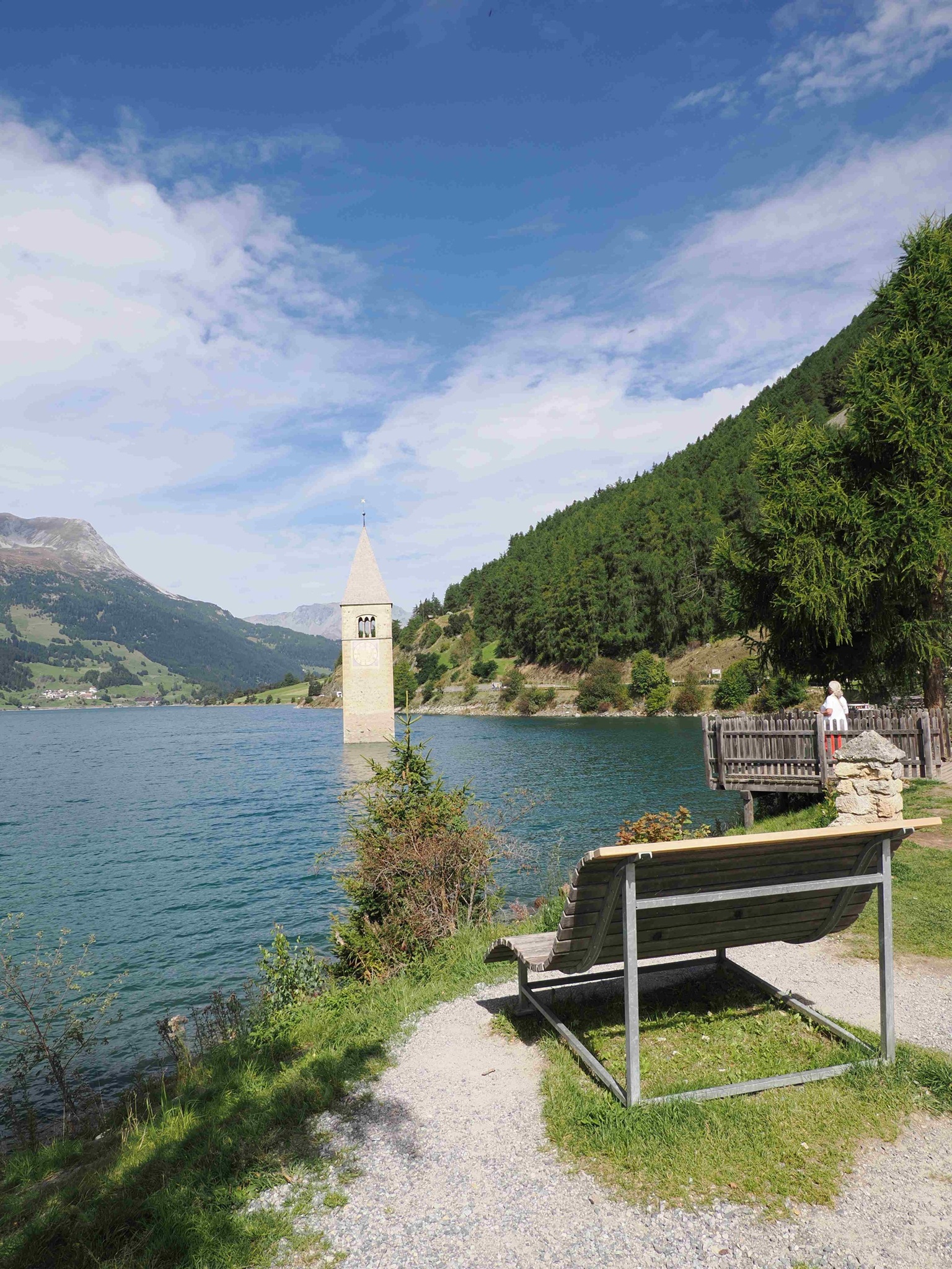 Die Nacht war sehr frisch, wir hatten gerade einmal 10°C und mussten doch ein wenig heizen. Unsere heutige Route soll uns über den Reschenpass führen und wenn es vom Wetter passt, wollen wir auch noch über das Stilfser Joch fahren. Insgesamt war es schon ziemlich voll, sowohl auf der Fahrt zum Reschenpass als auch der Pass an sich. Es sind aber alle entspannt und geduldig hintereinander her gefahren, so darf es gerne häufiger sein. Wir machen einen kurzen Fotostopp an der versunkenen Kirche im Reschensee, der Hauptparkplatz war uns aber zu voll, so sind wir auf den kleineren Platz direkt hinter dem Tunnel gefahren.